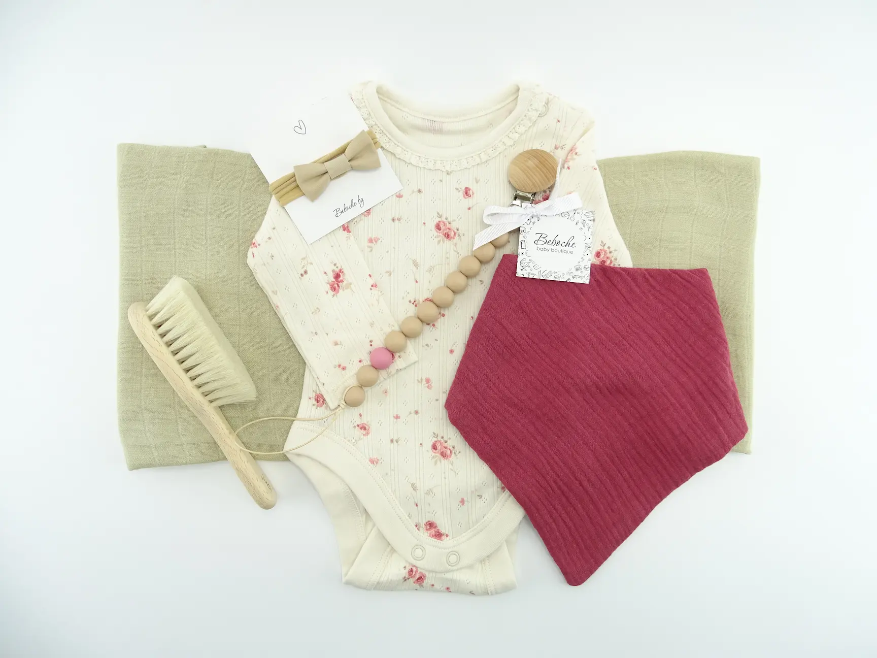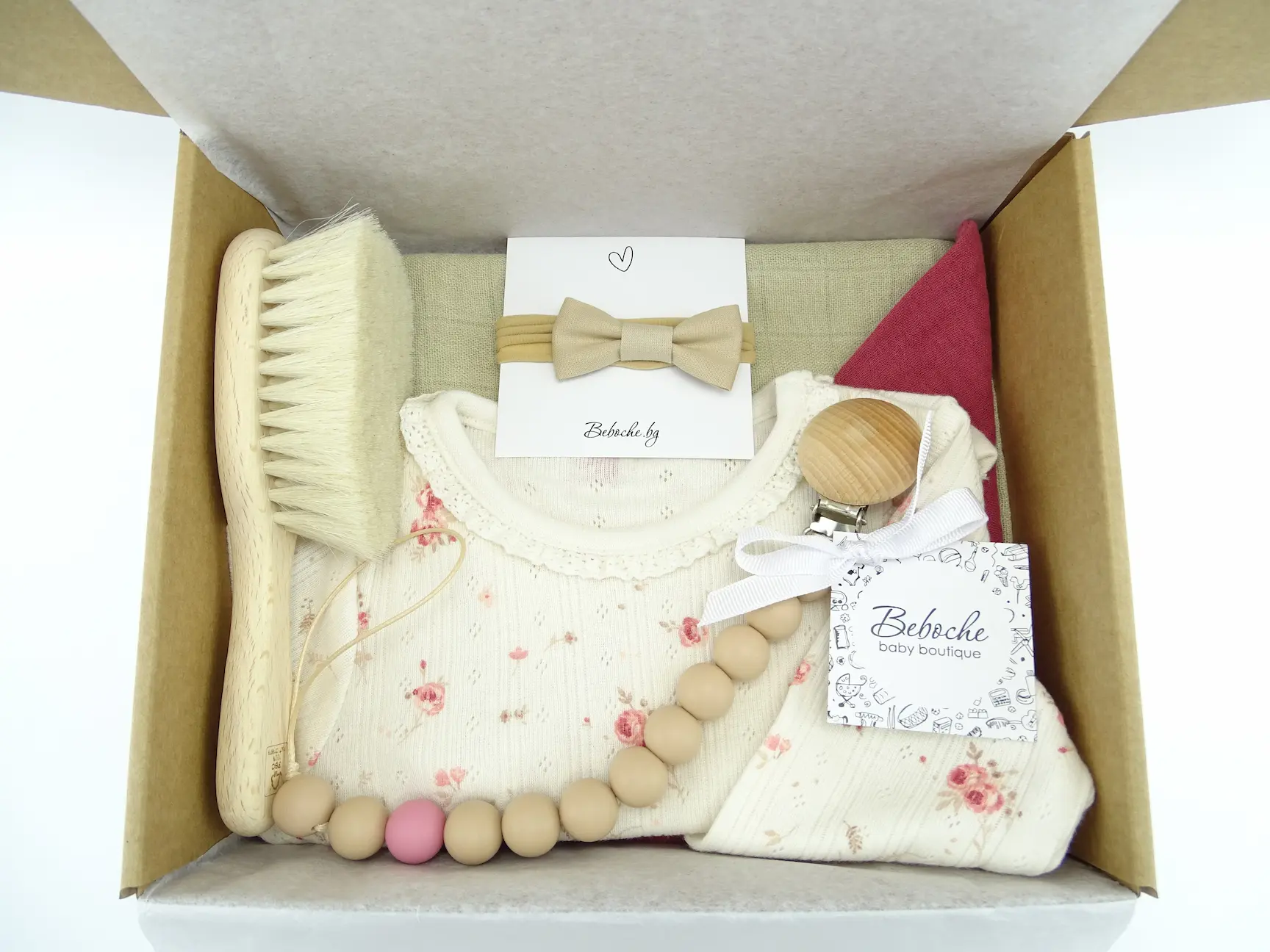 Beboche е онлайн магазин за подаръци за новородени, предлагащ най-великолепните бебешки аксесоари и принадлежности. Всяка кутия съдържа основни продукти, от които всяка майка има нужда за новороденото си бебе. Внимателно сме подбрали редица стилни и уникални продукти. Кутия за бебе момиче с бежова муселинова пелена.