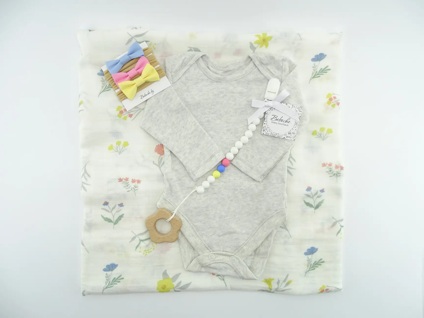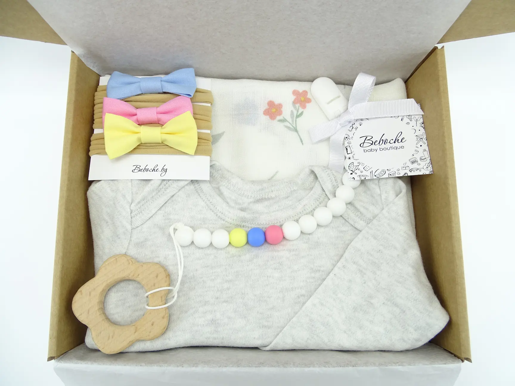 Beboche е онлайн магазин за подаръци за новородени, предлагащ най-великолепните бебешки аксесоари и принадлежности. Всяка кутия съдържа основни продукти, от които всяка майка има нужда за новороденото си бебе. Внимателно сме подбрали редица стилни и уникални продукти. Кутия за бебе момиче с дървена гризалка цвете.