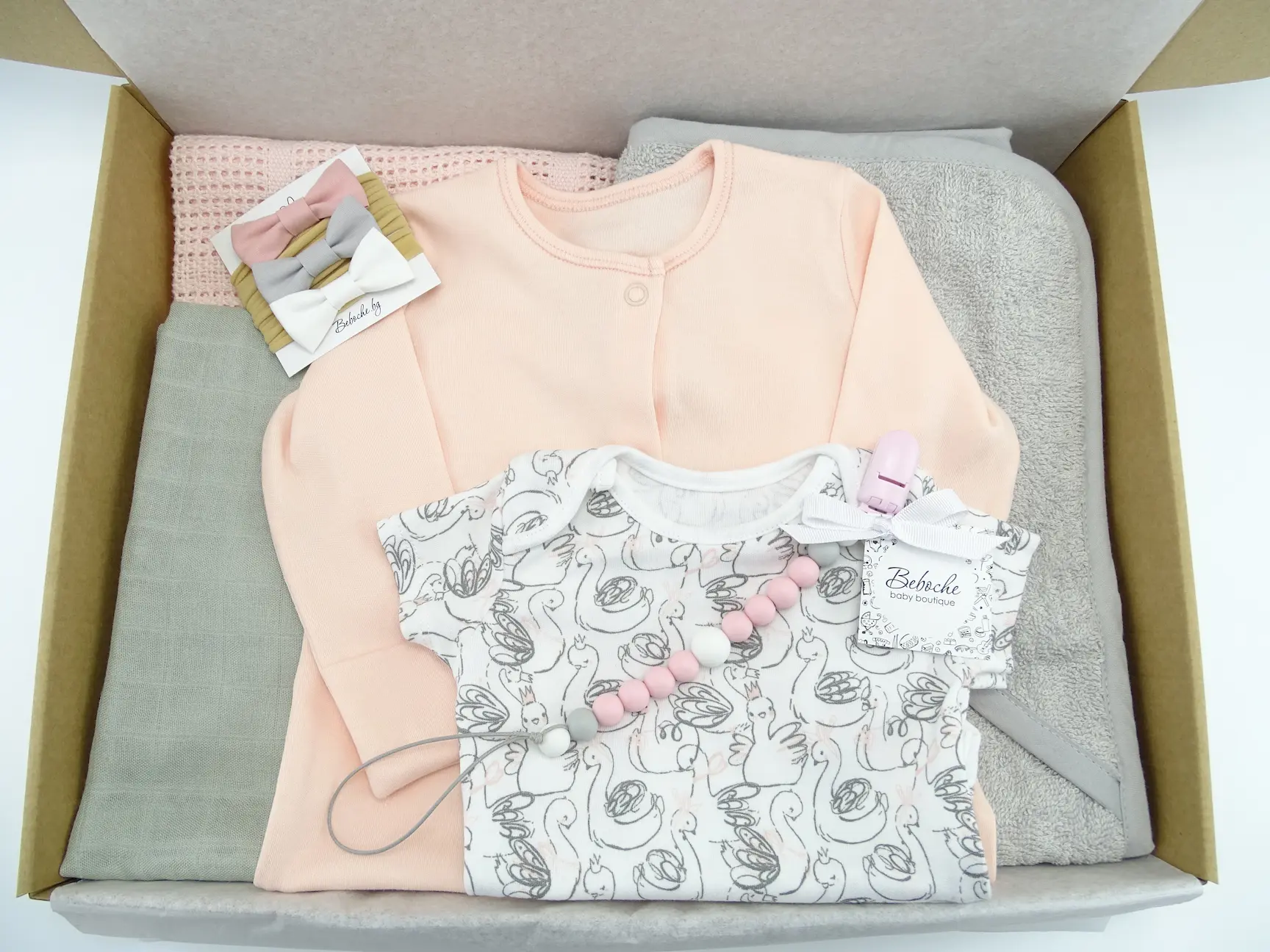 Beboche е онлайн магазин за подаръци за новородени, предлагащ най-великолепните бебешки аксесоари и принадлежности. Всяка кутия съдържа основни продукти, от които всяка майка има нужда за новороденото си бебе. Внимателно сме подбрали редица стилни и уникални продукти. Бебешки подаръчен сет в розово и сиво.