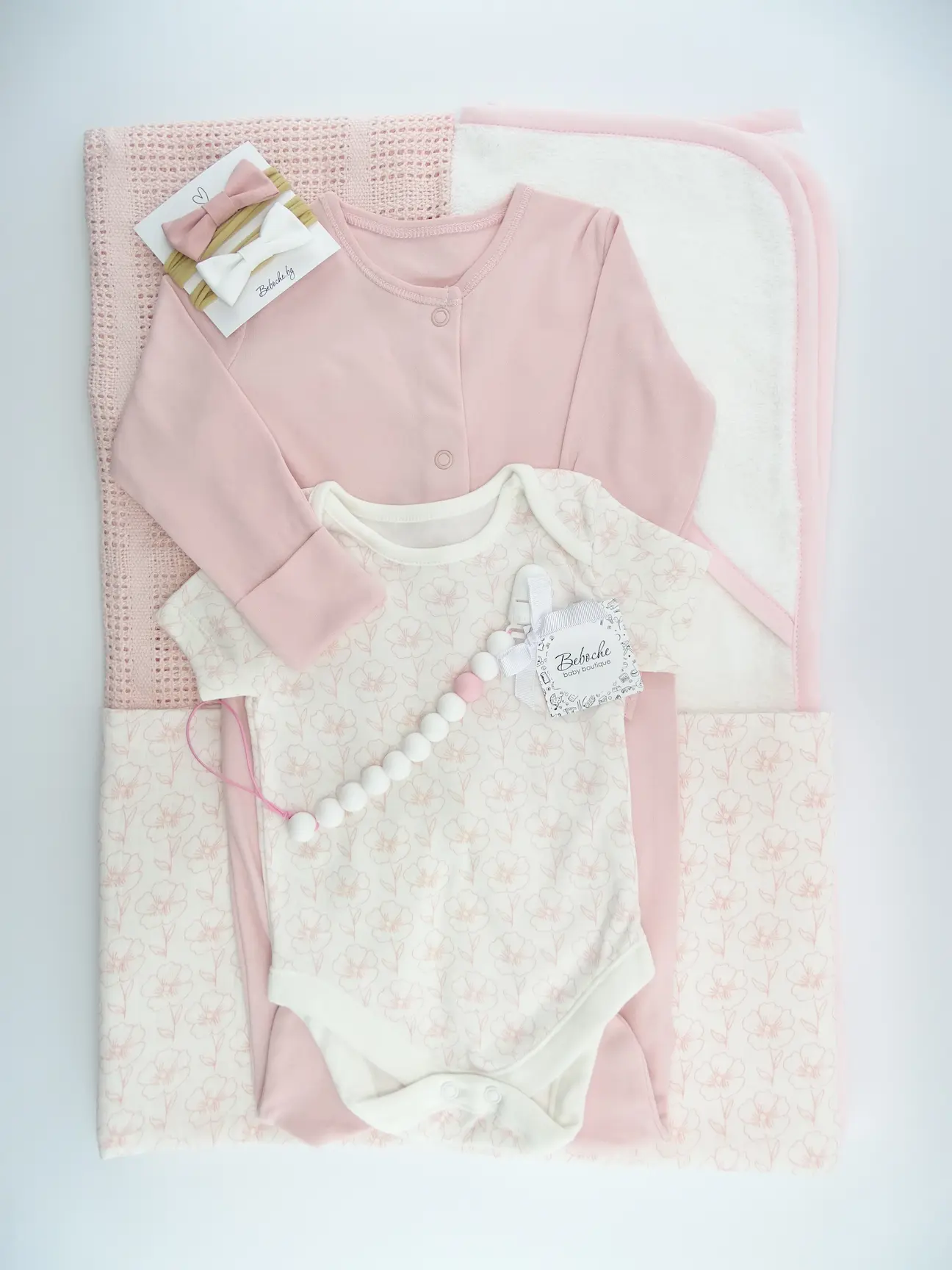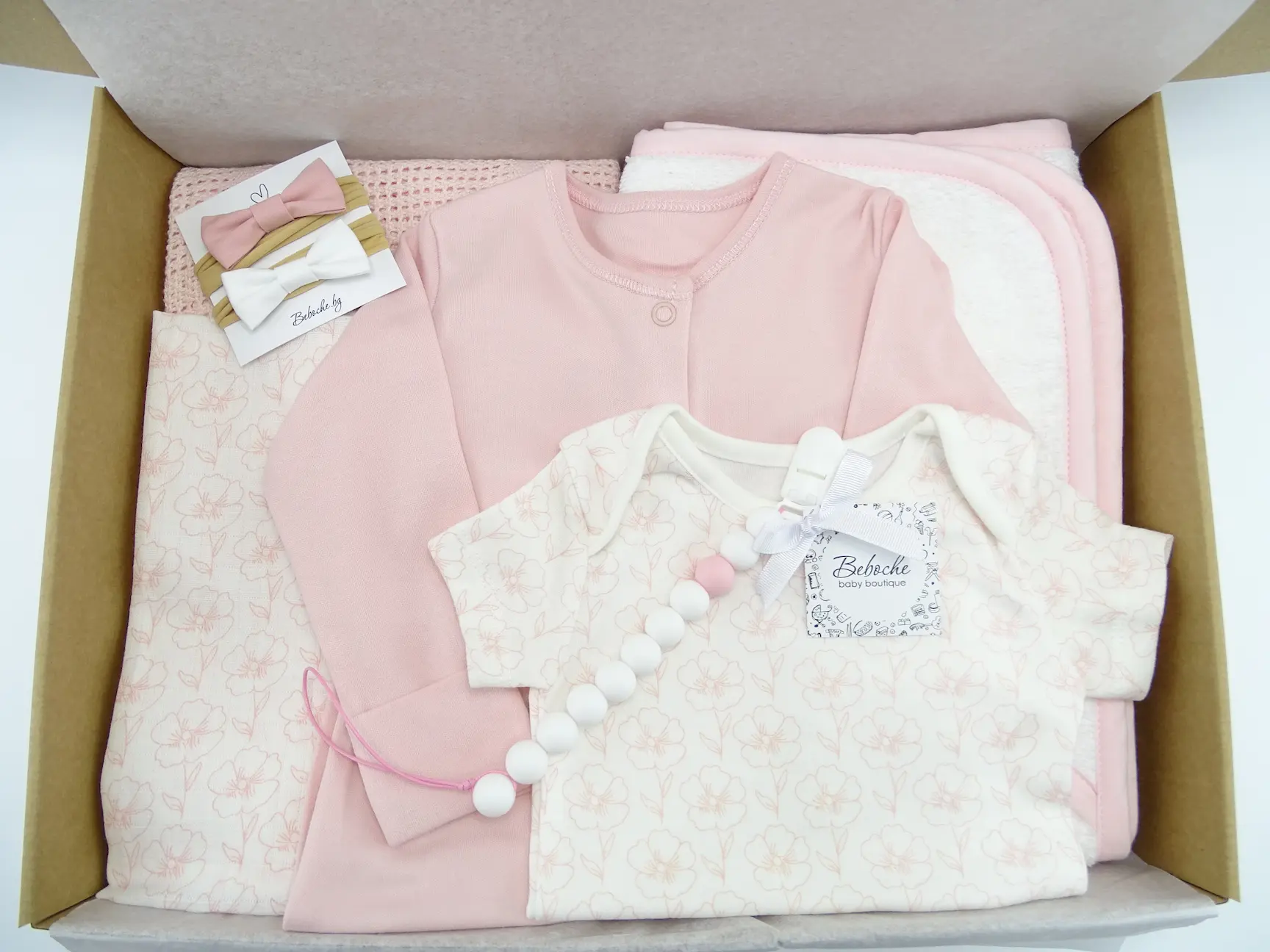 Beboche е онлайн магазин за подаръци за новородени, предлагащ най-великолепните бебешки аксесоари и принадлежности. Всяка кутия съдържа основни продукти, от които всяка майка има нужда за новороденото си бебе. Внимателно сме подбрали редица стилни и уникални продукти. Кутия за бебе момиче в бяло и розово.