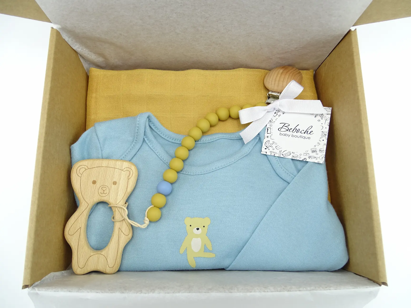 Грижливо сме ги съчетали в кутия, за да направим купуването на уникален подарък лесно и удобно. Бебешки дрешки, персонализирани аксесоари, ръчно изработени играчки. Нашите комплекти са красиви, модерни, но и практични. Кутия подарък за момче с дървено мече.