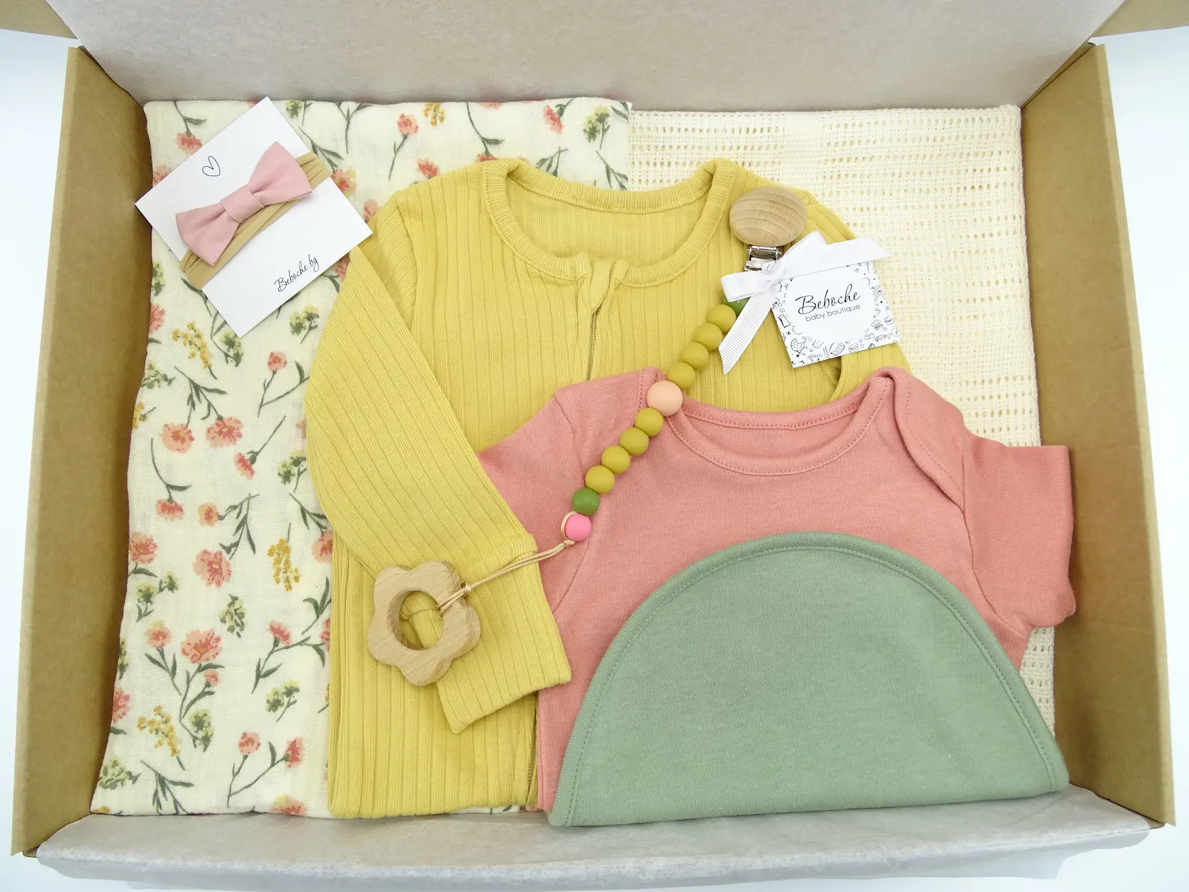 Beboche е онлайн магазин за подаръци за новородени, предлагащ най-великолепните бебешки аксесоари и принадлежности. Всяка кутия съдържа основни продукти, от които всяка майка има нужда за новороденото си бебе. Внимателно сме подбрали редица стилни и уникални продукти. Комплект за бебе с пелена на цветя.