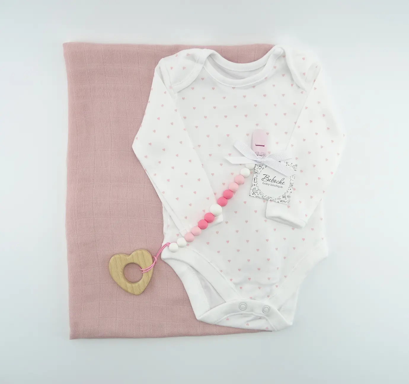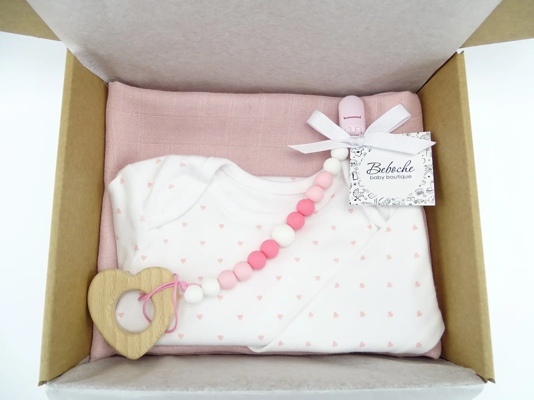 Beboche е онлайн магазин за подаръци за новородени, предлагащ най-великолепните бебешки аксесоари и принадлежности. Всяка кутия съдържа основни продукти, от които всяка майка има нужда за новороденото си бебе. Внимателно сме подбрали редица стилни и уникални продукти. Малка кутия с клипс за биберон с дървено сърце.
