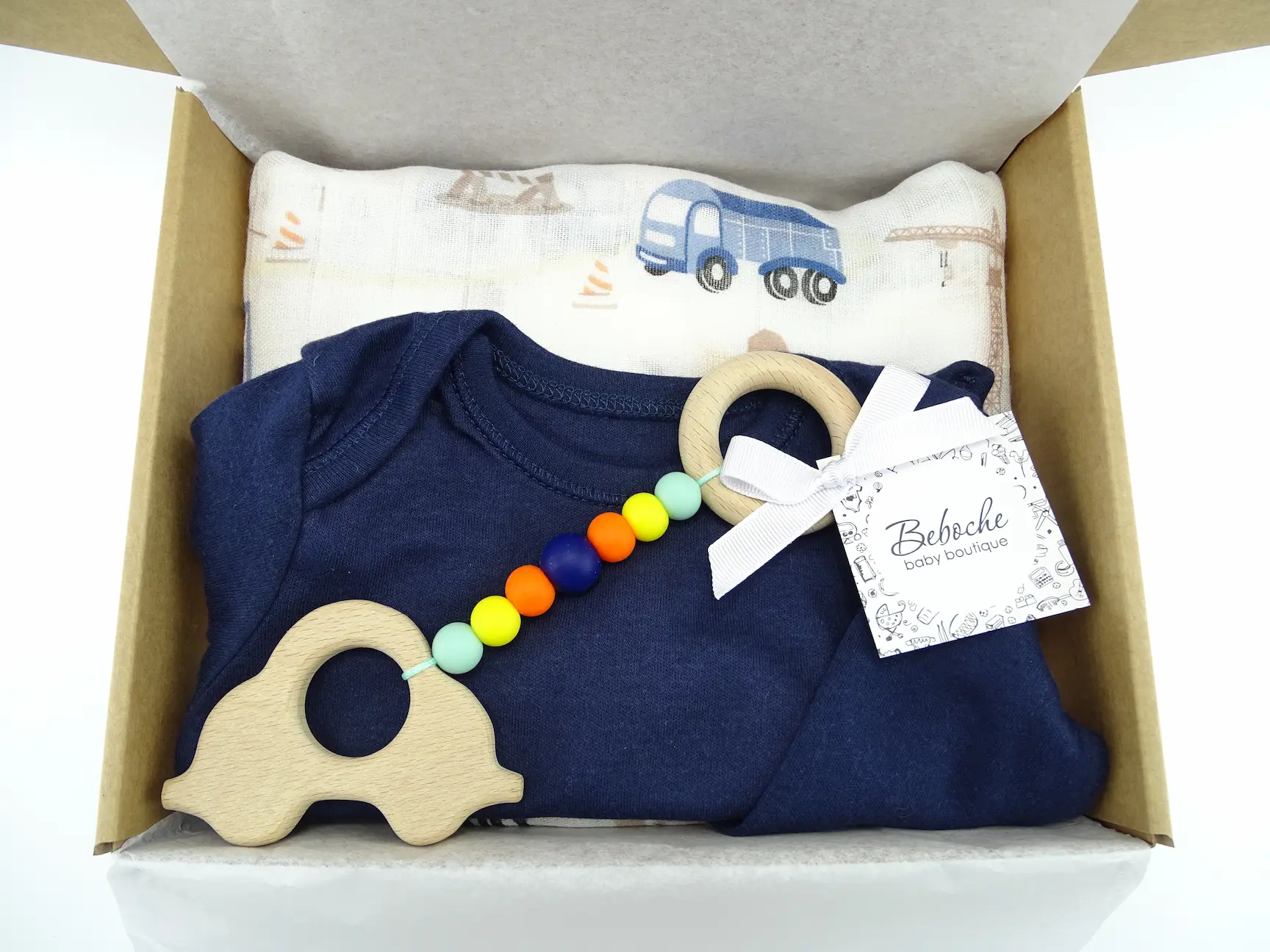 Грижливо сме ги съчетали в кутия, за да направим купуването на уникален подарък лесно и удобно. Бебешки дрешки, персонализирани аксесоари, ръчно изработени играчки. Нашите комплекти са красиви, модерни, но и практични. Момчешка кутия с пелена на камиончета.