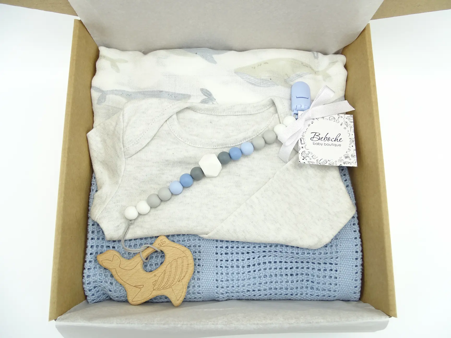 Подарък за новородено бебе / Бебешки подаръчни кутии за момче / Кутия подарък за погача на момче / Комплект за бебе момче с пелена на китове